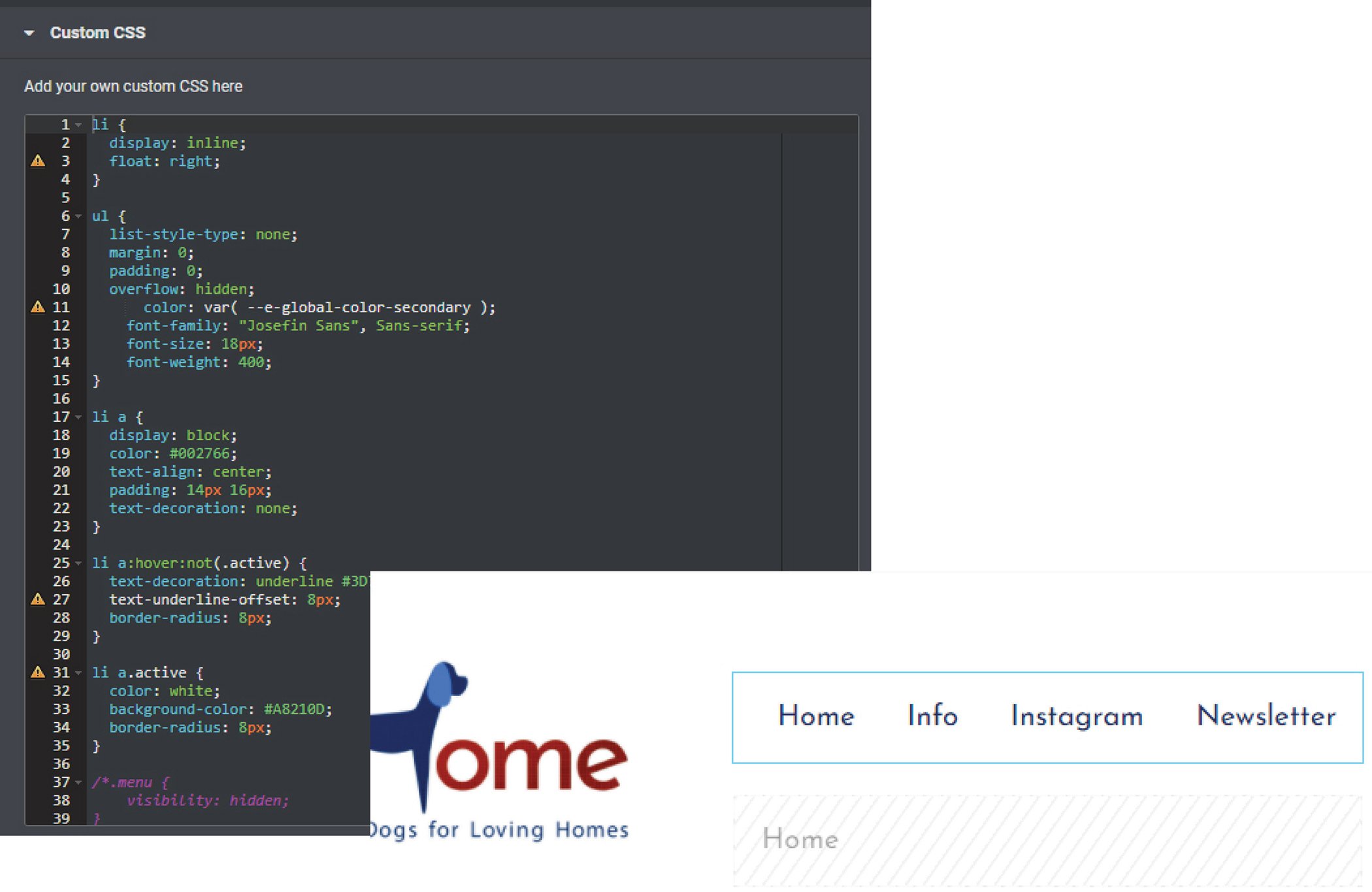 custom CSS for header nav